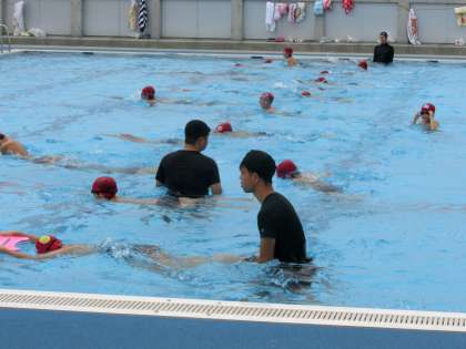 第1部は高学年対象、日光から帰ってきたばかりの6年生が、疲れを見せずに18人参加していました。先生からポイントを教わりながら、クロールや平泳ぎの練習に取り組んでいました。