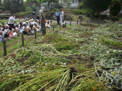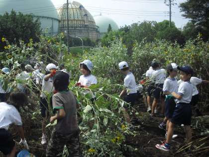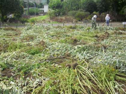 日差しも出てきて気温も高くなる中で、子どもたちは熱心に作業に取り組みました。ひまわりの咲いていた場所は、平地となりました。学校に戻ってきた子どもたちは、ひまわりの花やキバナコスモスなどの花を持ち帰って来ていました。次の花の丘活動が楽しみです。