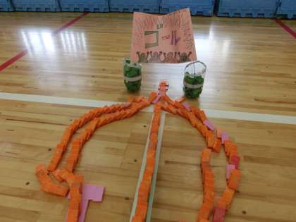 堂々の完成です。待ちに待った瞬間がやって来ました。大勢のギャラリーが見守る中、カウントダウンとともに、いよいよドミノたおしがスタートです。ここから先は言葉なんか要りませんね。