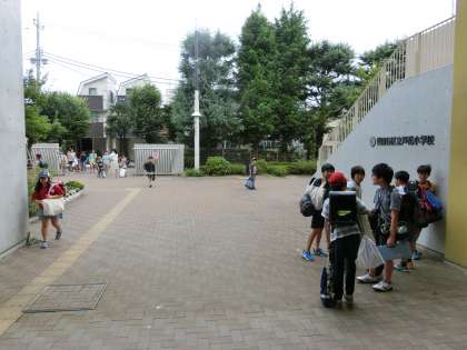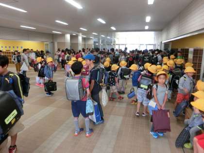 8時、入室目前の様子です。ピロティでは、張り切って登校してきた大勢のお友達が、教室に入れる時間をまだか、まだかと待っています。空っぽのげた箱も、もうすぐ靴で埋まります。