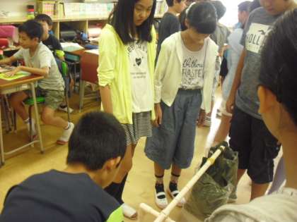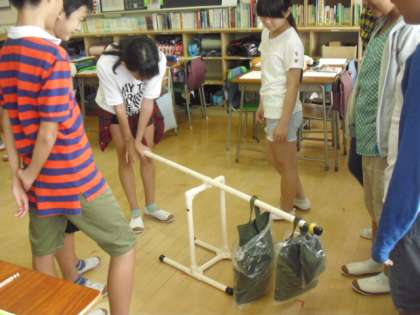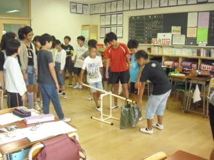 道具を使って軽い力でものを持ち上げる「てこの原理」を、実験を通して学んでいく過程でした。重い砂の重りをどこにぶら下げると、力の入れ加減が変わってくるのか・・・、体験を通して実感できた知識はきっと生きて働く力となることでしょう・・・