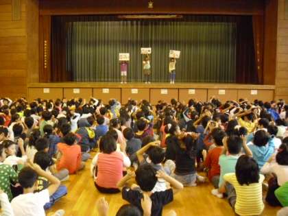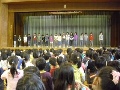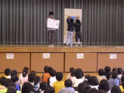 今朝の児童集会の様子です。整備委員会が委員会の活動について発表しました。みんなが楽しめるように、活動の内容をクイズ形式にしたり、劇にしたりして工夫していました。整備委員会がどんな活動をしているのか、わかりやすく伝えることができました。