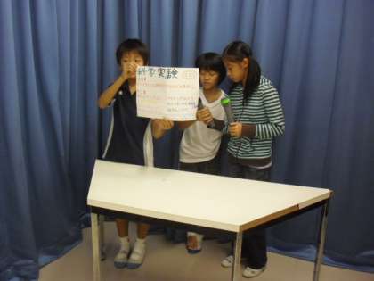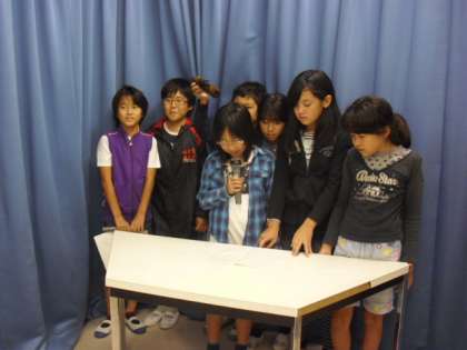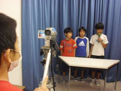 お昼の校内放送の様子です。今回は5年生が、子どもまつりのお店のPRをしました。用意してきた原稿に目を通しながら、自分たちのお店の特徴を紹介しています。中には昆虫を持参し、寸劇を行っていたグループもいました。