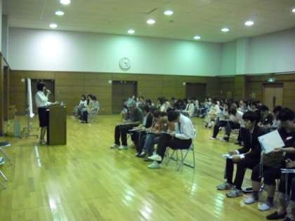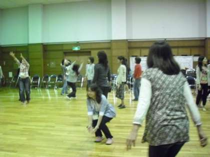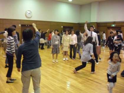 心がほぐれてきたので、今度は体を動かして、さらにコミュニケーションを深めます。体ほぐしのエクササイズです。エアなわとび、エアボール投げを行いました。みんなで気持ちを合わせて見えない縄を跳んでいきます。心を合わせるとないはずの縄が見えてくるから不思議です。エアボール投げも、相手が投げるボールの大きさ、重さ、投げる強弱や角度を予測したり、対応したりしながらパスを続けていきます。まるで目の前にボールがあるかのような感覚を覚えます。