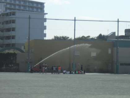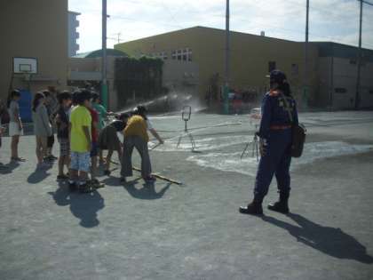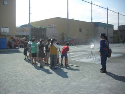 火災発生時に消火器を使って火を消す訓練、ポンプ車で水を放水する訓練を体験しました。