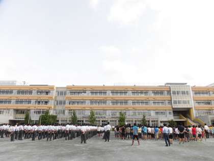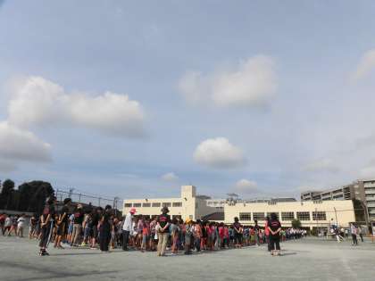 爽やかな秋空のもと、8時25分から校庭で、小中合同朝会が開かれました。1200名を超える児童・生徒が参集し行われる朝会は、本年度2回目になります。中学校の直田校長から、「あいさつキャンペーンを通してもう一度、一人ひとりのあいさつの仕方について振り返ってみましょう。」と講話をいただきました。
