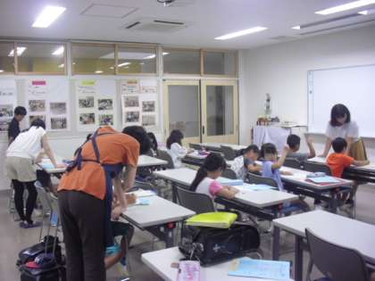 クラブ活動の時間に、放課後算数補習教室「寺子屋クラブ」を実施しています。問題に挑戦し、わからないことをそのままにせず、先生に教えてもらいます。あっているかどうかは芦花サポーターであるお母様方が対話しながら丸を付けてくださっています。