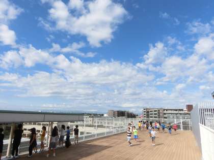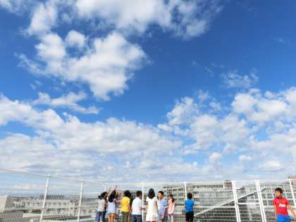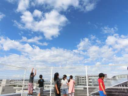 4年生が理科の時間に屋上へ出かけました。見上げると、真っ青な空に白い雲がぽっかり。日射は強いものの、吹き抜ける風が心地よい朝でした。