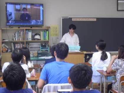 1学期に車いすバスケットで交流した三宅選手のビデオメッセージを見て、パラリンピックレポーターとして、自分たちが調べた競技の何を伝えるか話し合いをしていました。