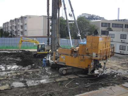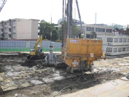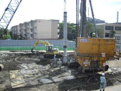 今日の工事の様子です。大きなクレーンに釣られた大きな杭をドリルで堀った穴に入れている瞬間です。作業をしている方と比べるとその大きさに驚きます。