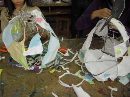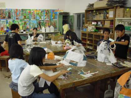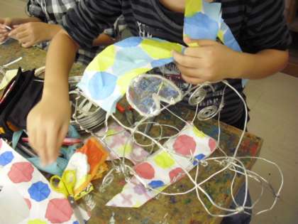 図工の授業の様子です。前回、紹介したときは、針金の骨組みだけでしたが、色のついた紙をはりつけて作品ができ上がりつつあります。「光のファンタジー」というタイトルのように幻想的な作品です。