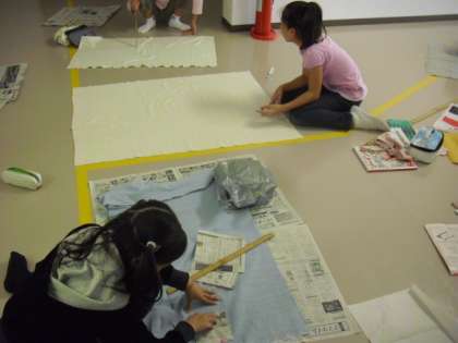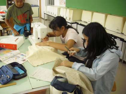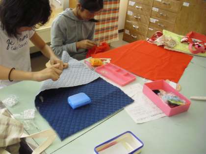 家庭科の授業の様子です。「生活に役立つもの」というように、それぞれ思い思いの作品の制作に取り組んでいます。カバン、クッション、枕、エプロン、ワンピース等々。大きな型紙づくりが必要な人は、廊下のスペースを使って取り組んでいました。