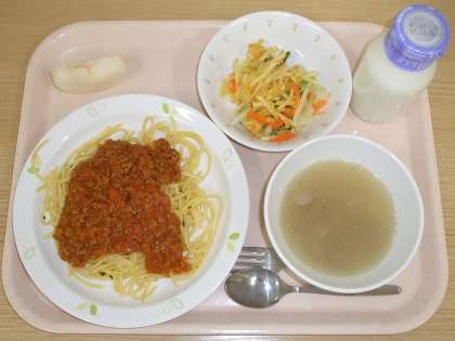 スパゲッティは人気の料理の1つです。今日は、ミートソースに“カレー粉”をプラスした「カレーミートソース」です。スパゲッティの茹で具合もちょうどよく、どのクラスもおいしそうに、よく食べていました。