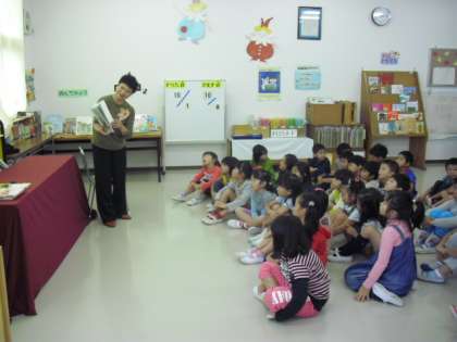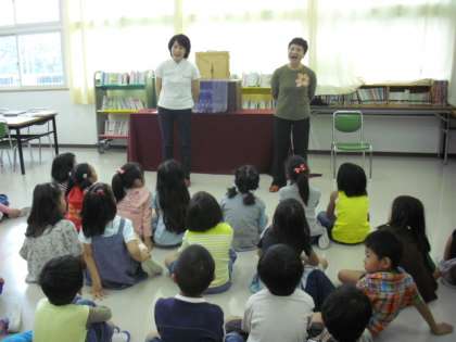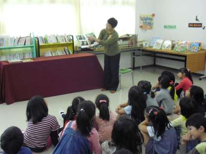 1年生の「お話会」読み聞かせの様子です。本と子どもたちの反応を見比べながら上手に読み聞かせを進めます。1年生がお話に集中するように、読み聞かせだけでなく、紙芝居を間に挟んだり、歌を取り入れたりと展開も工夫されていました。読書の秋ですね。