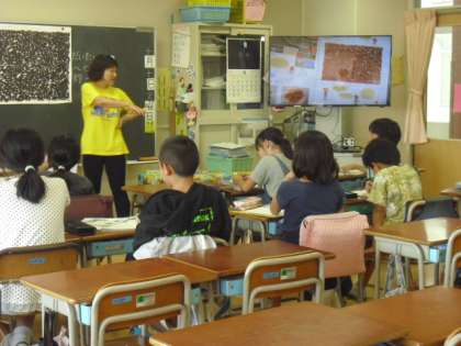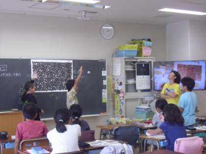 たくさんのどんぐりは全部で何個あるといえばよいか、「だいたい」「およそ」を使って自分なりの考えを皆にわかるように説明していました。
