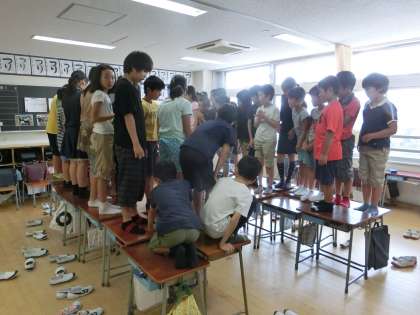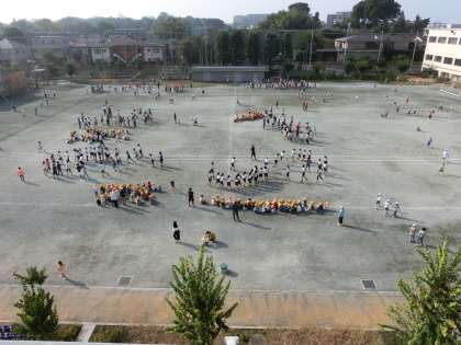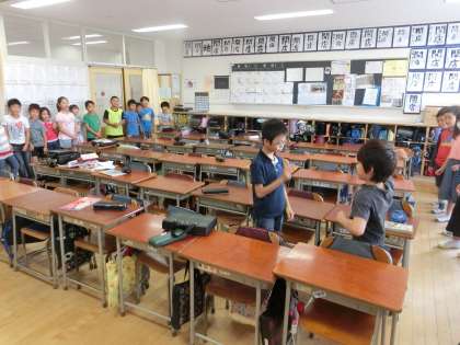 兄弟学級同士が集まり、それぞれ割り当てられた場所で、活動が展開していました。スペースが限られる教室では、遊びの内容に一段と工夫が必要ですが、上の学年がリードしながら、楽しくゲームに興ずる姿が見られました。