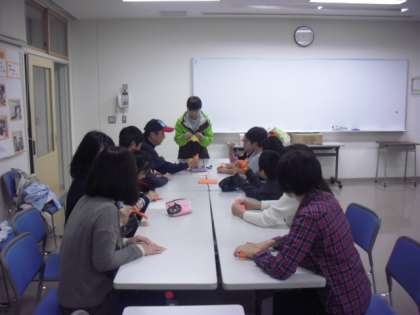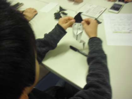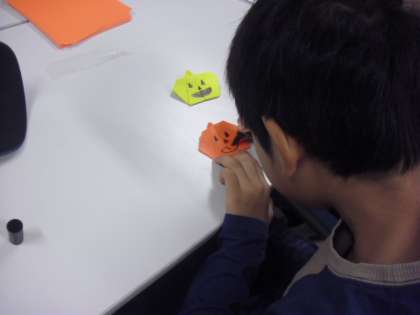 折り紙の折り方を教わって、顔などを描き、ラミネートして・・・
