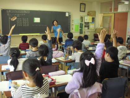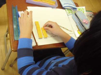 ブロックを順番に5こずつ並べたり、絵で書き表したり、5+5+・・・とたし算で求めたり、5,10,15・・・と5とびで数えたり、自分なりの方法で答えを求め、考え方を共有しあっていました。