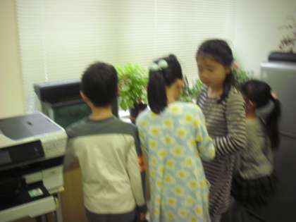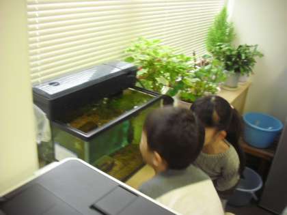 出席の報告をするなり、校長室のメダカを気にかけてのぞく子どもたちです。