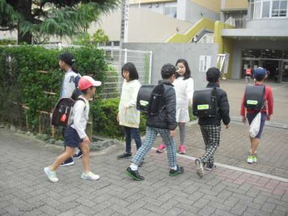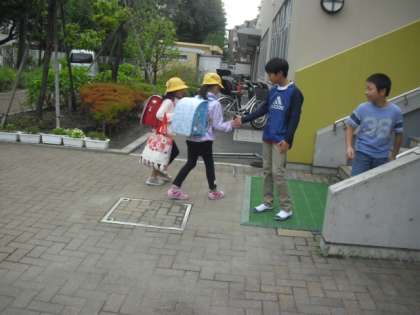 あいさつ隊がハイタッチで迎える中、子どもたちが元気に登校してきました。