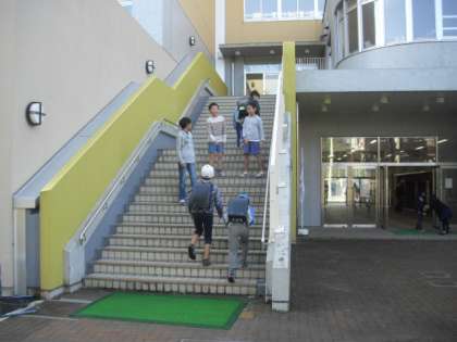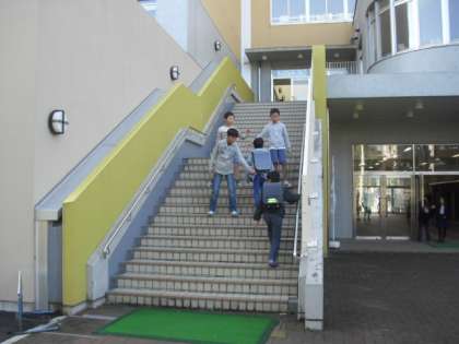 あいさつ隊の4年生が正門、外階段でもお出迎えです・・・・