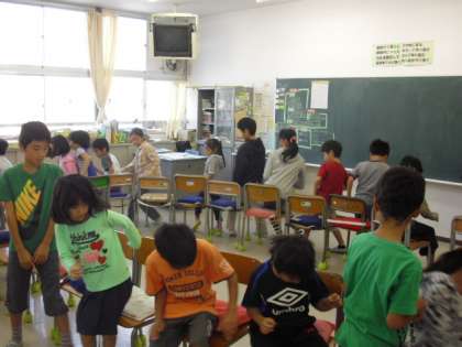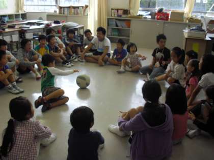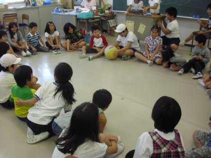 教室内でも工夫して交流を深めます。輪になって遊べば互いの顔も見合うことができます。音楽を流しながらいす取りゲームをしたり、ボールを回して楽しんだりと、教室からも笑い声が聞こえてきました。