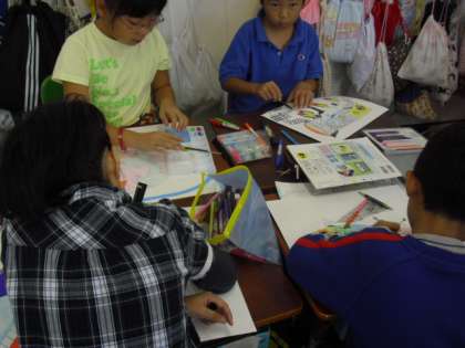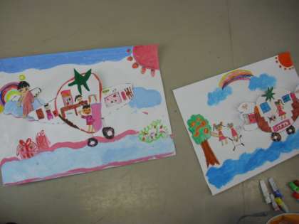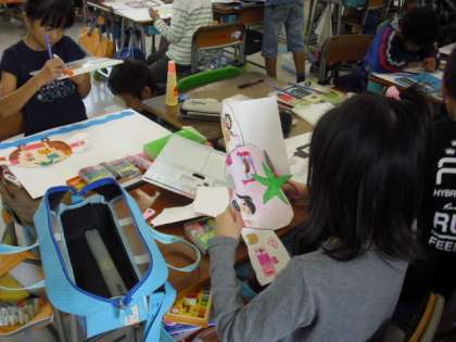 3年生の図工の授業の様子です。「夢ののりもの」を制作しています。のりものは立体感を出すために切りぬいたものを使っています。のりものの中もそれぞれに工夫していました。生活しやすいようにキッチンやリビングがあったり、宇宙に行くためにロケットエンジンがついていたり・・どんなのりものが出来上がるのか楽しみです。