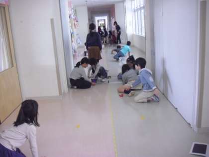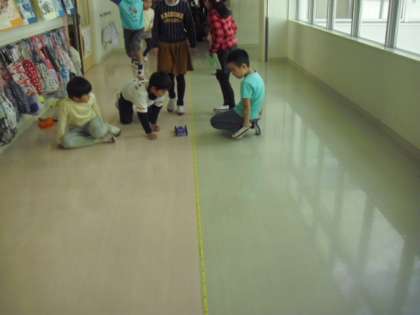廊下に巻尺を伸ばして、ゼロの目盛りから車を走らせます。