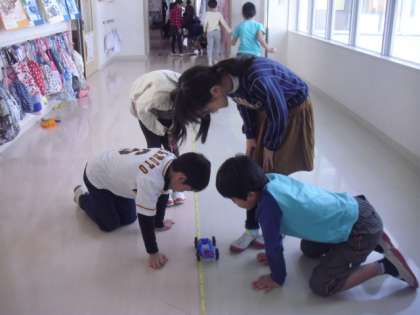 ゴムが伸び、もとに戻ろうとする動きを使って、車がどれだけ走るかの実験です。