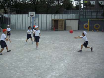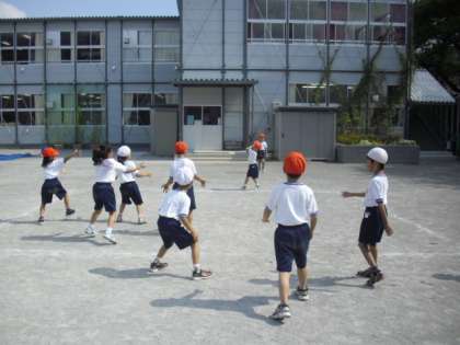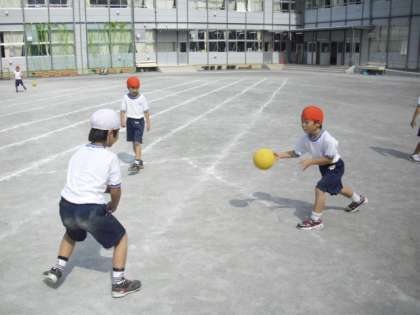 1年生の体育の授業の様子です。ボールゲームを楽しんでいるところです。ボールを投げる、受ける、とる、よける・・・ボール遊びはいろいろな動きができます。1年生からボールに親しみ、ボールを投げる遊びをたくさんしてほしいです。