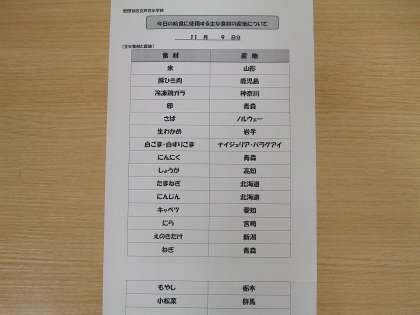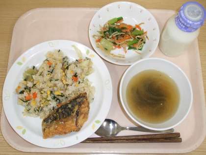 「今日の給食は“ぎょうざ”かな?」と一瞬思ってしまうような「ぎょうざ風チャーハン」。ぎょうざと同じ具材を使って、チャーハンに仕立てています。炒り卵の黄色が、彩りを添えていました。
