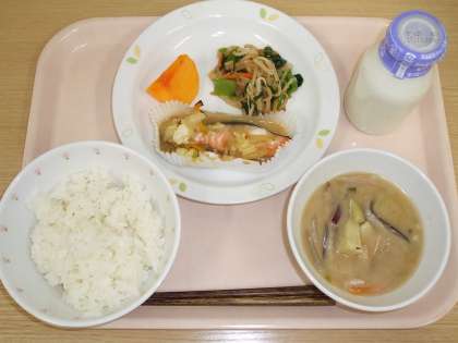 今日の主菜は、郷土料理百選にも選ばれている、北海道の郷土料理「鮭のちゃんちゃん焼き」です。給食では1人分ずつカップに作りました。味付けに“みそ”や“バター”を使うのが特徴で、鮭と一緒に野菜もたっぷり食べられる料理です。