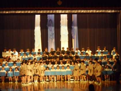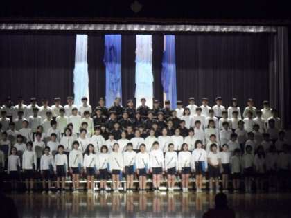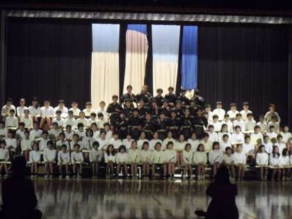5年生の劇、八郎です。コール隊の響きと歌声が効果的です・・・