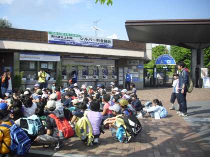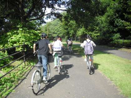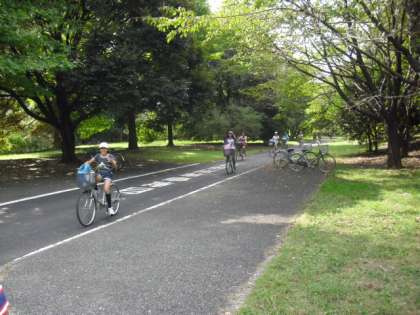 入場してサイクルセンターで自転車を借ります。グループ行動です。第1のチェックポイント「みんなの原っぱ」を目指します。グループの人員を報告して、それぞれが計画した場所に向かいます。