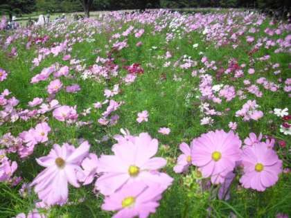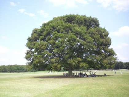 お昼のチェックポイントは「みんなの原っぱ」の大きな木の下です。ここでチェックを受けてお弁当です。コスモス畑がとてもきれいでした。本部の大きな木も・・コマーシャルで見たような木ですね。