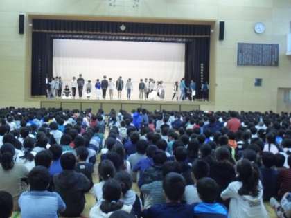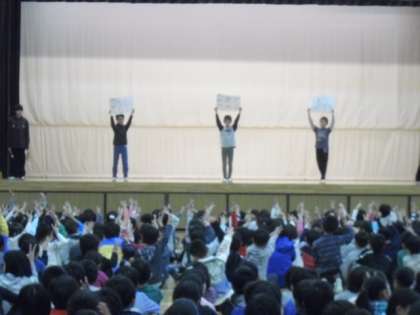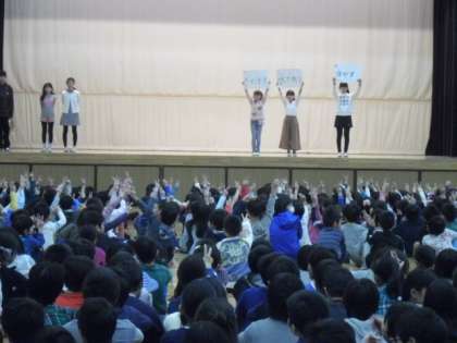 今日の集会は保健委員会からの問題です。けがの予防や、病気の予防に関するクイズが出題されました。