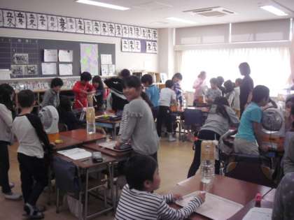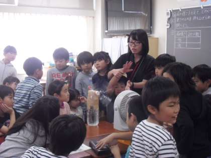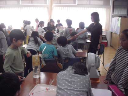 風の強さが強いとき、弱い時を比較して、風がものを動かす力と風の強弱とのかかわりについて考える学習をしていました。みんなで班ごとに実験です・・・・