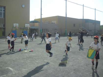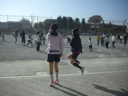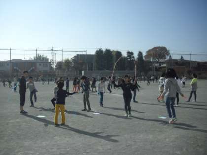 休み時間は校庭でいつものように短縄跳びやボールゲームにと楽しむ子どもたちです。
