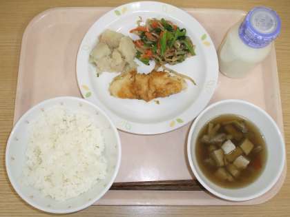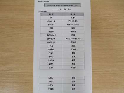 11月最後の給食です。「魚のバーベキューソース」には“メルルーサ”を使いました。特製の“バーベキューソース”は、りんごのすりおろしを中心に、しょうゆやレモン汁などを入れた、少し甘めのソースです。魚が苦手な児童にも、人気のある美味しいソースです。