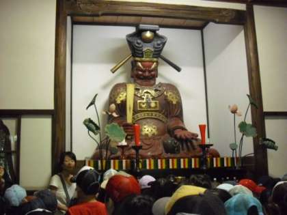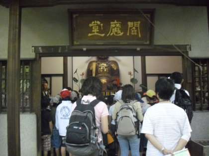 閻魔堂の閻魔様の像を見学しているところです。九品仏浄真寺は、閻魔堂をはじめ七堂伽藍の完備した僧房として数少ない寺院だそうです。日本では、嘘をついた子どもを叱る際「閻魔様に舌を抜いて貰う」という俗信による民間伝承がありますが、住職さんは3年生に分かりやすことばでお話してくれました。