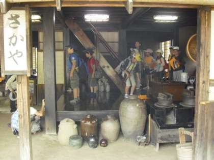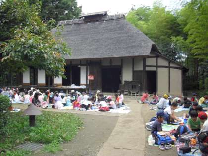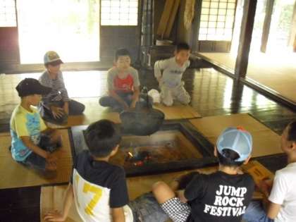 お弁当は、古民家の庭で食べました。昼食後は、時間まで園内を自由に見学です。囲炉裏を囲む子どもたち。実際に炭火が燃え、煙が出ていました。それだけでも生活の雰囲気が伝わってきそうです。
