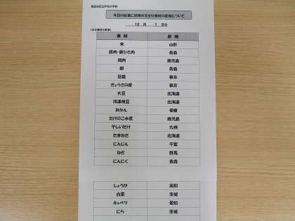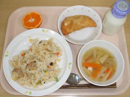 12月最初の給食は、人気メニューの1つ「ジャンボぎょうざ」です。たくさん詰まった具、きつね色にパリパリっと揚がった皮、家庭ではなかなか作れない特大サイズ!これが人気の秘密でしょうか。