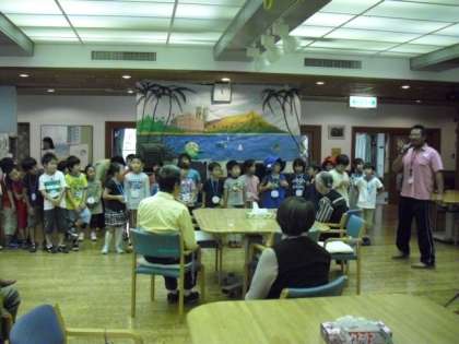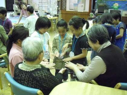 2年生の生活科での授業の様子です。「お話とどけたい」で作成してきた大型絵本を持って、芦花ホームに出かけました。まずは、芦花ホームの方々と手遊びを通して交流を図ります。2年生は、自然と話しかけたり、手を取ったりしながら手遊びを教え、いっしょに遊んでいました。芦花ホームの方々もとても楽しそうでした。
