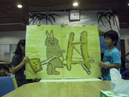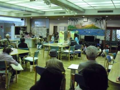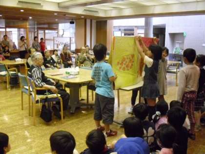 手遊びで心がほぐれたところで、大型絵本の読み聞かせです。1組が選んだのは「どうぞのいす」です。これまで時間をかけて、本作り、台詞読みの練習をしてきた成果が発揮できました。子どもたちは大きく、はっきりとした声でお話を進めます。芦花ホームの方々から大きな拍手をいただきました。