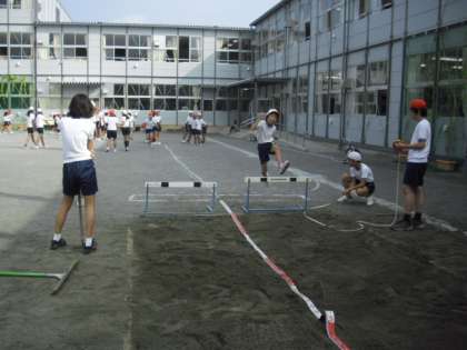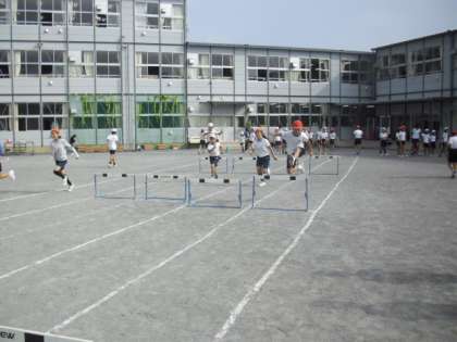 1時間目の6年生の体育の合同授業での様子です。走り高跳び、走り幅跳び、ハードル走、短距離走の練習場所を設け、取り組んでいます。練習の成果か、リズミカルに跳びこしたり、またぎこしたりする動きが見られます。自分の目標目指してがんばっています。