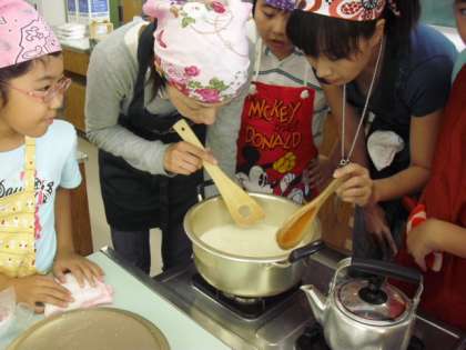 4年生の総合的な学習の時間の様子です。単元「ふしぎ!発見!大豆パワー」では、大豆の秘密に迫ります。大豆を使った加工食品の一つである「豆腐」づくりに挑戦です。あしか隊や保護者の方々の協力のもと、作業開始です。