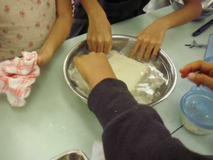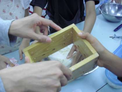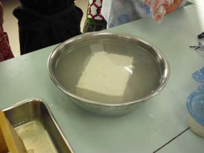 しばらくしてから、水を入れたボールに木枠を入れ、ふたや枠を外していきます。そーっと、そーっと、崩さないように・・・できた!手作り豆腐の完成です。子どもたちはもちろん、参加された保護者の方々も大喜びの瞬間でした。