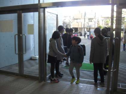 今日も登校してくる子どもたちに、声をかけ、ハイタッチしている6年生です。