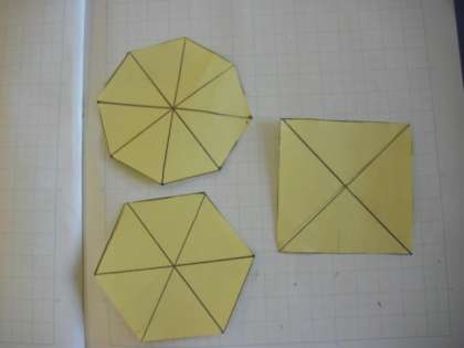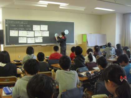 折り紙を使って整った形(正多角形)を作ることを通して、正多角形の定義を理解する学習です。作った形について、共通していること、違っていることを出しあっていました。