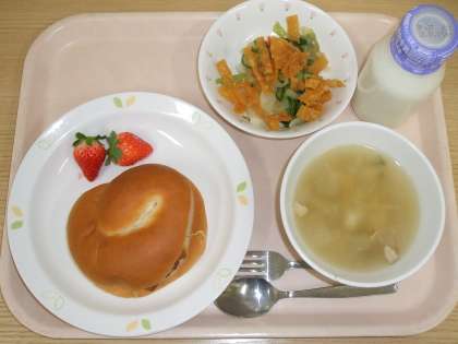 今日のデザートは、初物の「いちご」です。今回は熊本県産の“ほのか”という品種でした。甘酸っぱくて、ビタミンCが豊富な「いちご」は、風邪の予防にもオススメの食材です。